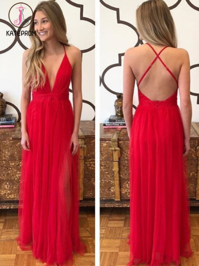 Kateprom Sexy Backless Red Tulle Prom Dresses, Long Evening Dresses KPP0163
