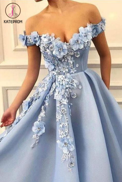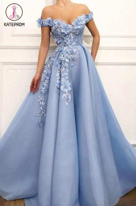 Kateprom Beautiful Off Shoulder A-line Long Blue Prom Dresses with Flower KPP0164