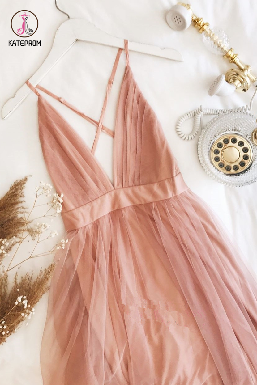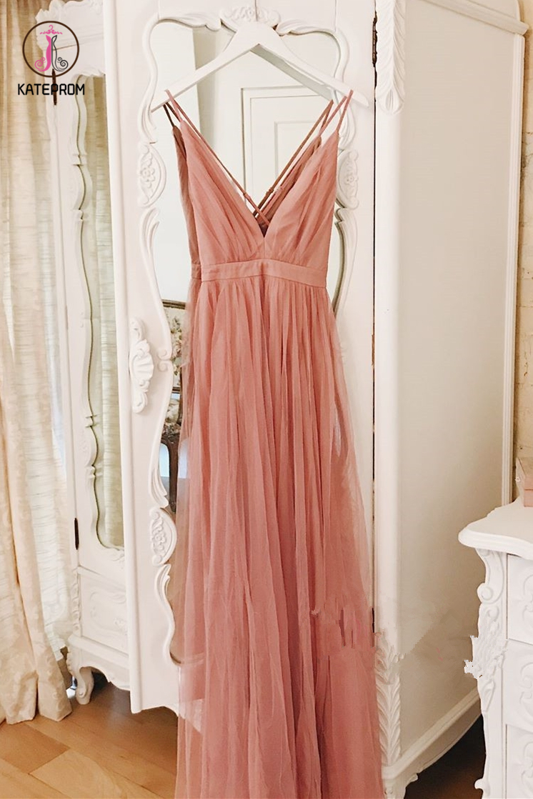 Princess V Neck Pink Tulle Long Prom Dress KPP0278