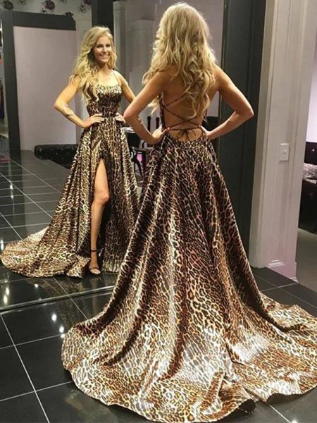 Open Back Prom Dresses Spaghetti Straps Aline Leopard Print Prom Dress Slit Evening Dress KPP0339
