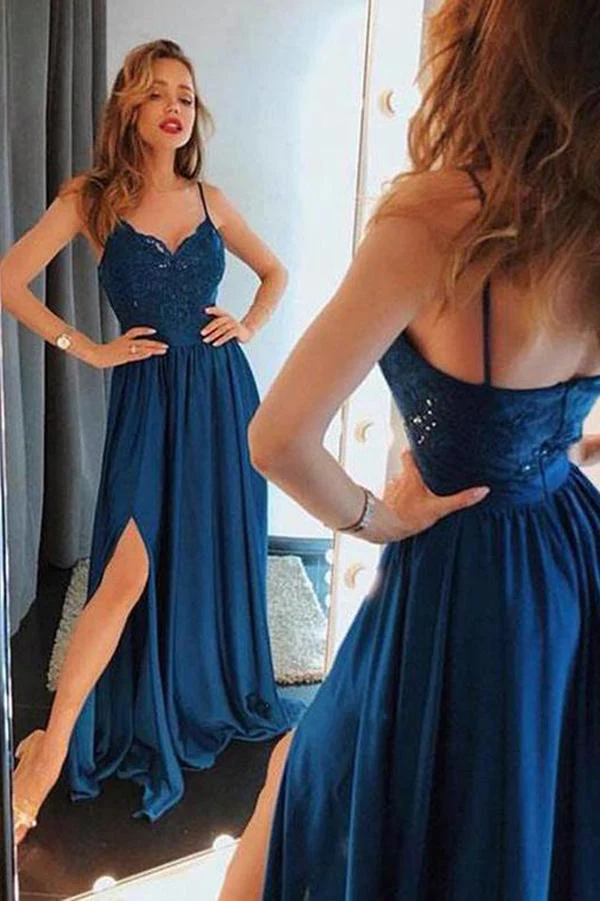Black Prom Dresses with Spaghetti Straps A-line Long Cheap Slit Prom Dress KPP0369