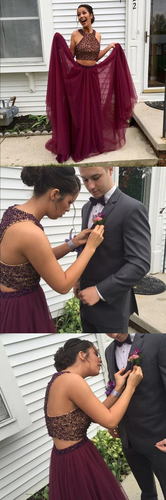 Two Piece Prom Dresses Scoop Floor-length Long Beading Prom Dress Sexy Evening Dress KPP0395