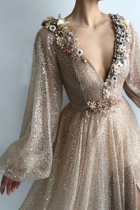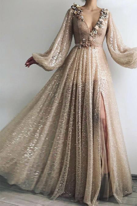 Long Sleeve Sequin V-Neck Prom Dress with Split Handmade Flowers KPP0618