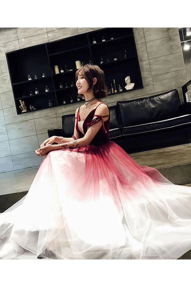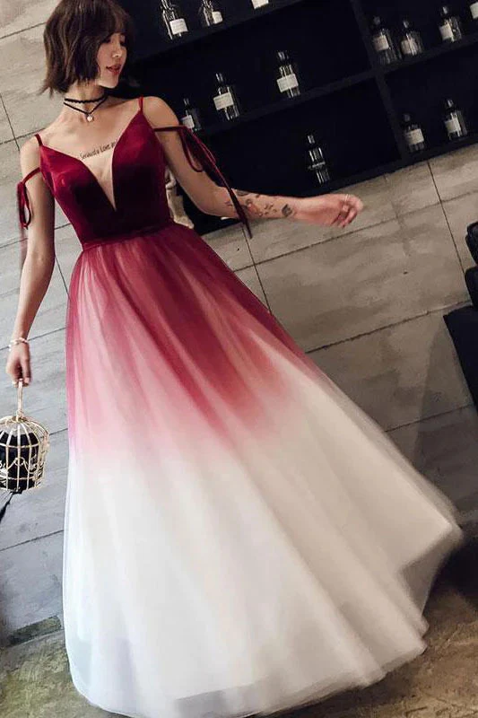 A Line Spaghetti Straps Ombre Long Tulle Prom Dresses Burgundy V-Neck Evening Dresses KPP0725