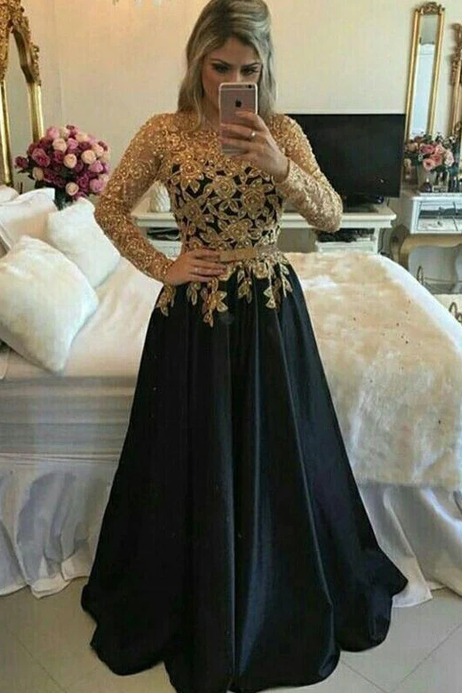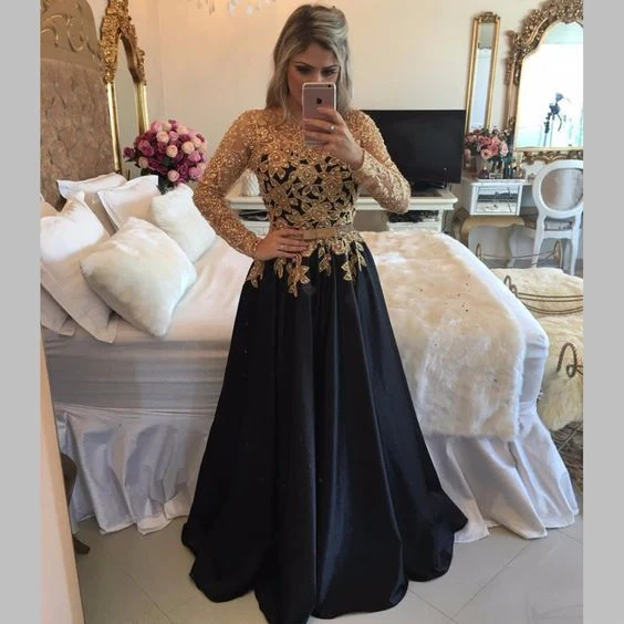 A Line Lace Black Puffy Pearls Gold Evening Dresses Long Sleeve Appliques Prom Dresses KPP0726