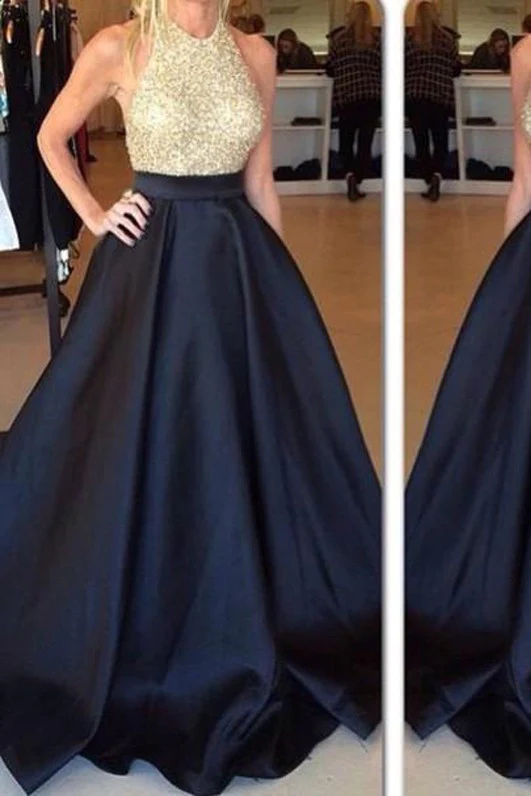 New Arrival Crew Neck Gold Sequins Black Satin Backless Sleeveless Prom Dresses KPP0739