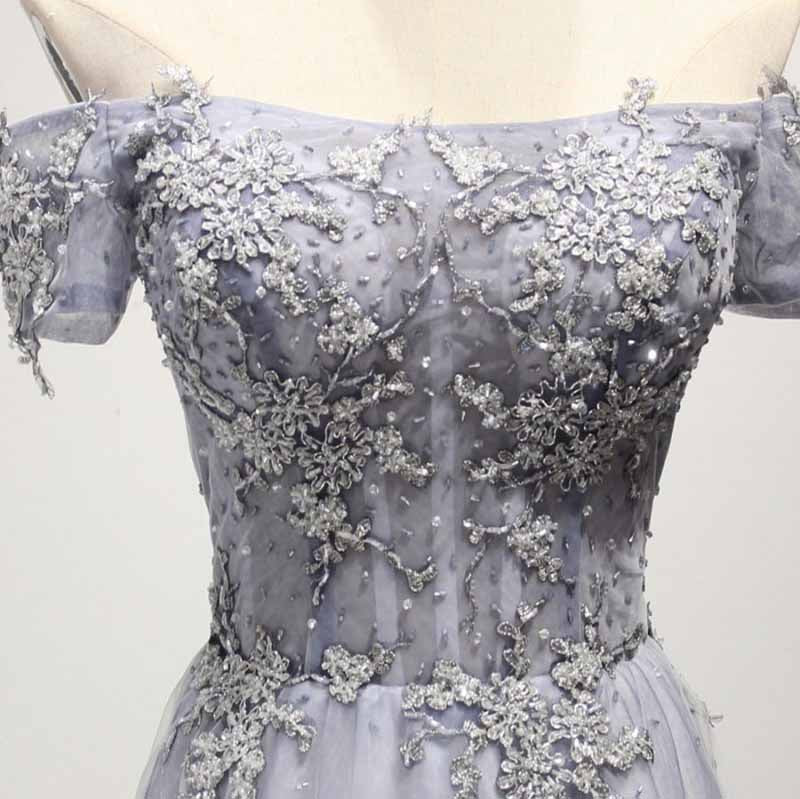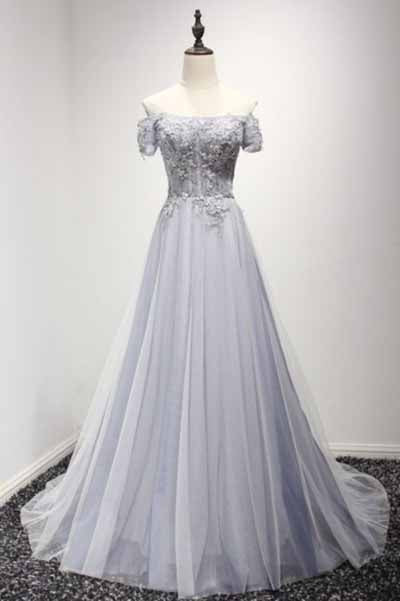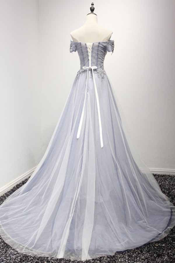 Dusty Blue A Line Off-the-Shoulder Tulle Lace up Prom Dresses with Appliques Lace KPP0754