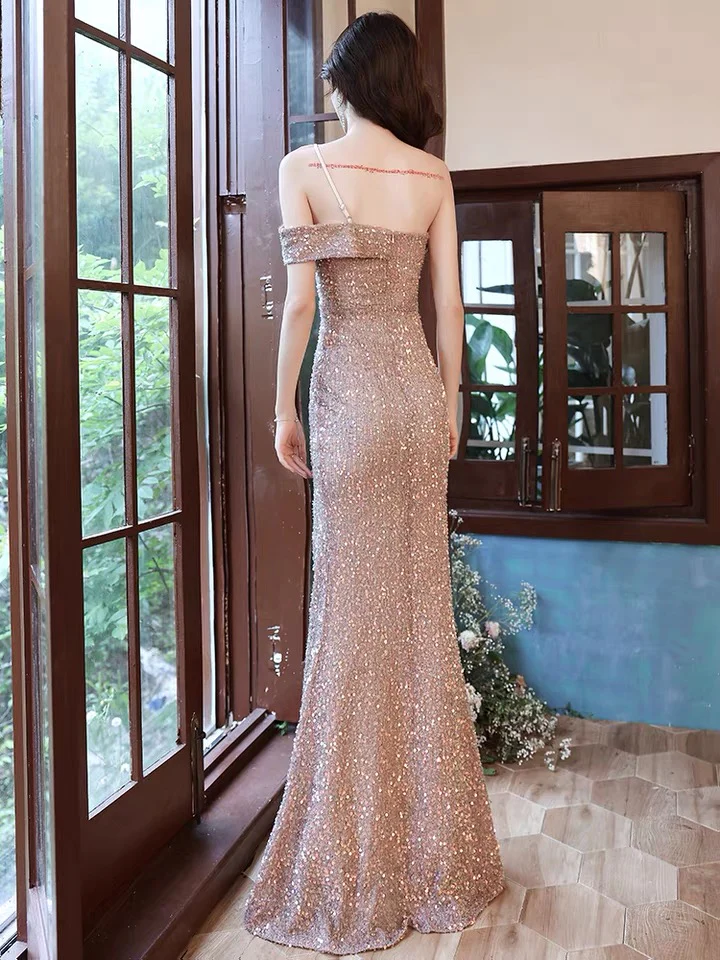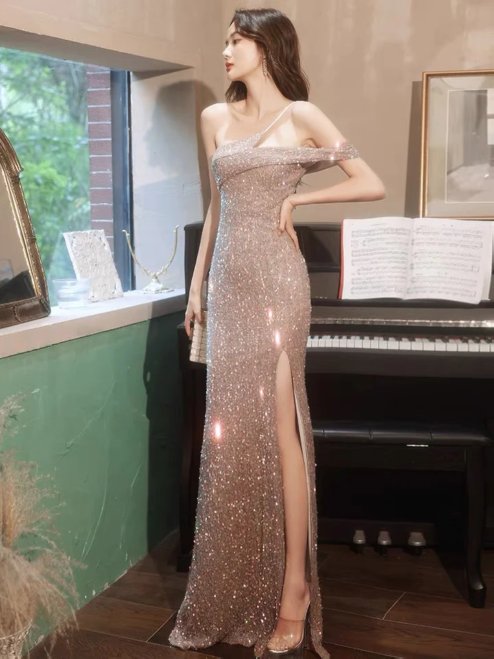 One shoulder Sparkle Crystal Long evening Gowns Mermaid Side Split Prom Dresses KPP0926
