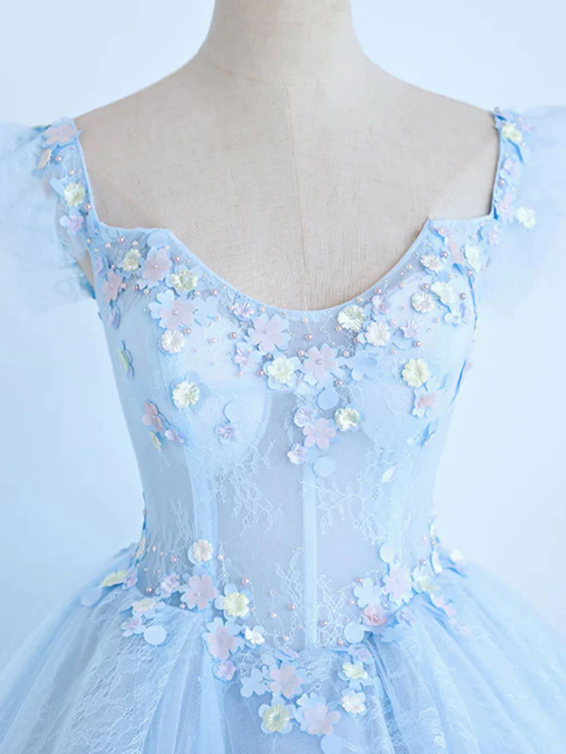 A-Line Blue Tulle Lace Long Prom Dress, Blue Formal Evening Dresses KPP0943