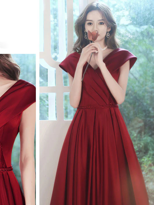 Burgundy v neck satin long prom dress, burgundy evening dress KPP1046