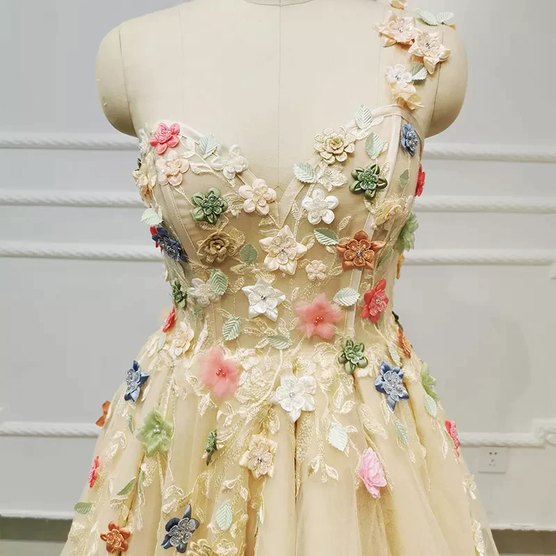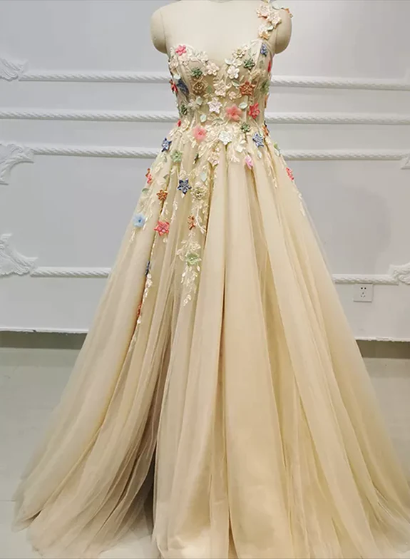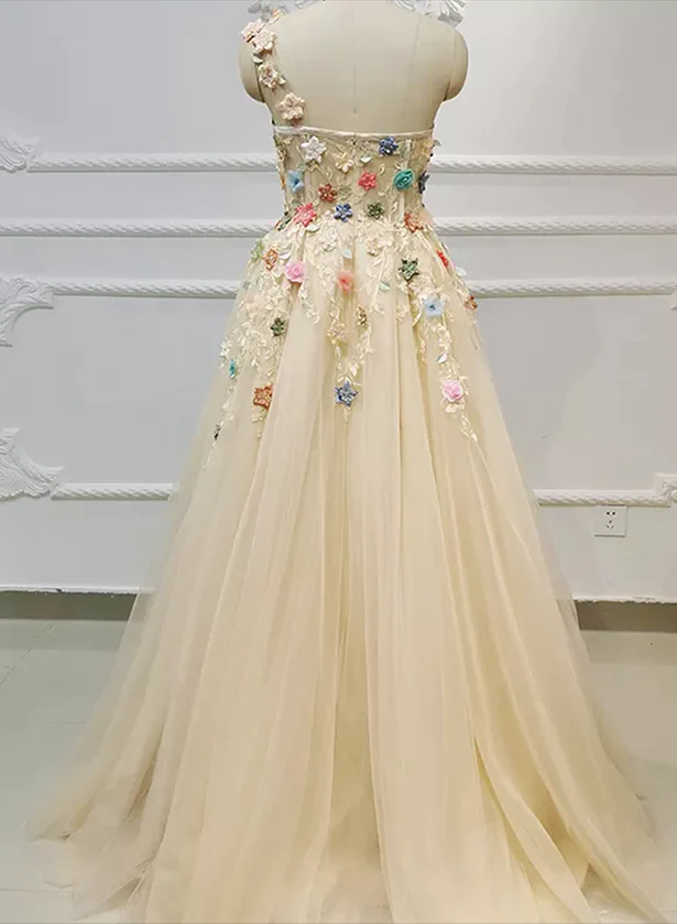 Light Champagne Tulle with Flowers Long Evening Dress, A-line Tulle Formal Dress KPP1377
