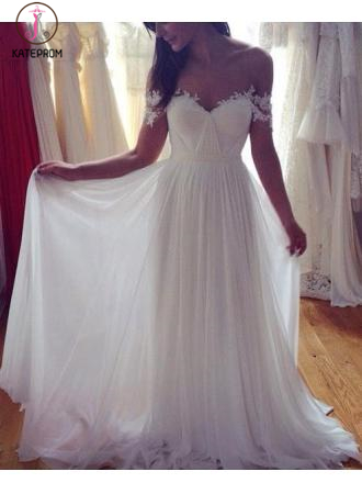 Kateprom Simple Elegant Off shoulder Beach Wedding Dresses 2020 Floor Length With Appliques, Cheap Wedding Dress KPW0028