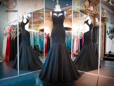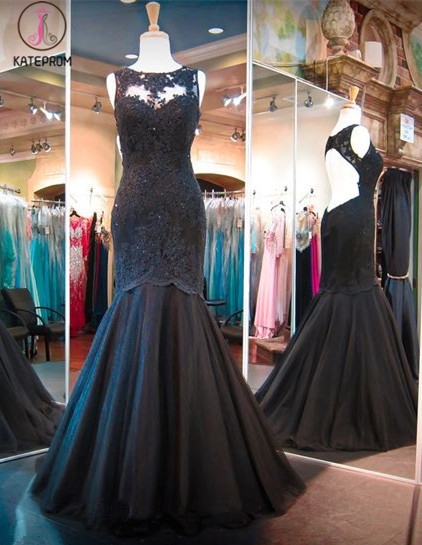 Kateprom Open Back Black Wedding Dress Tulle Long Mermaid Evening Dress, Formal Lace Prom Dress KPW0029