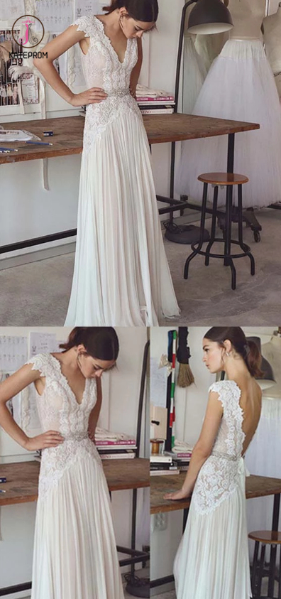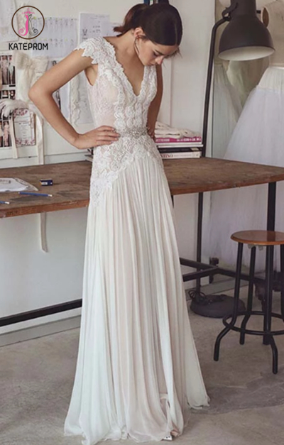 Kateprom A Line Floor Length Lace Appliques Beach Wedding Dresses KPW0049