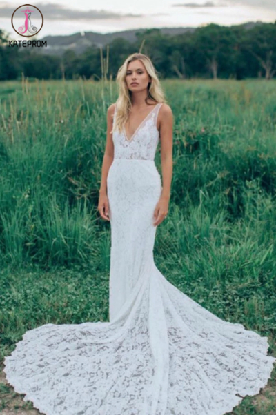 Kateprom Charming Sheath Sweep Train V Neck Lace Appliques Wedding Dress KPW0058