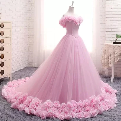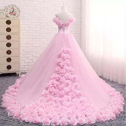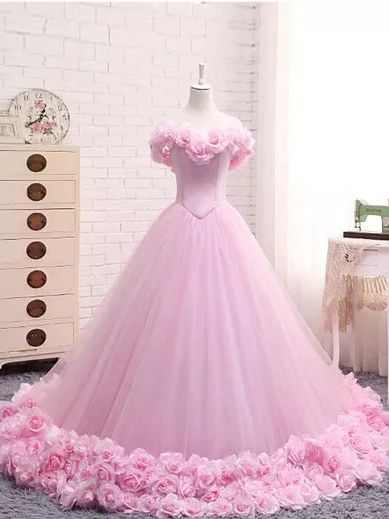 Ball Gown Wedding Dresses Off-the-shoulder Hand-Made Flower Pink Bridal Gown KPP0509