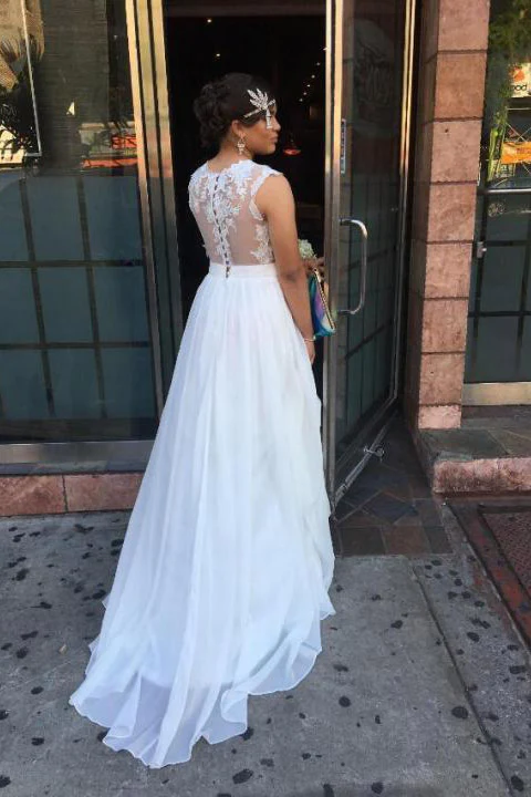A-Line White Lace Prom Dress With Appliques, Side Slit Sexy Dress KPP0513