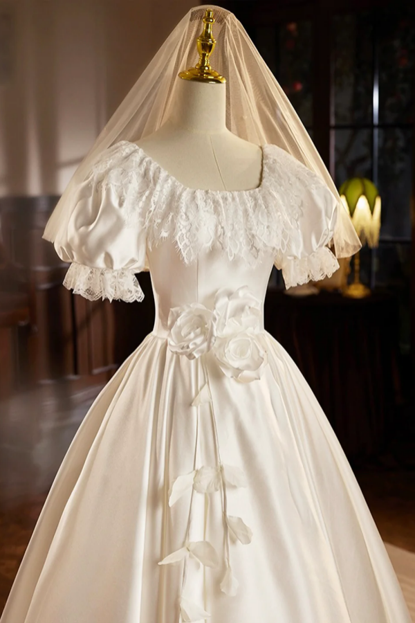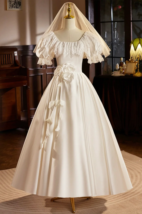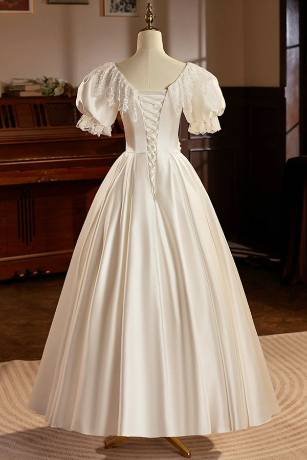 White Satin Tea Length Prom Dress with Lace, ALine Evening Party Dress KPP1713