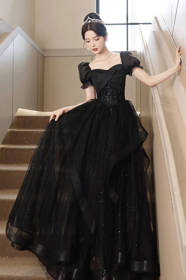 Black Tulle Lace Short Sleeve Floor Length Prom Dress, Black A Line Evening Party Dress KPP1717