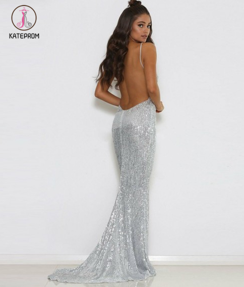 Kateprom Sexy Backless Mermaid Sweep Train Silver Sequined Prom Dress KPP0119