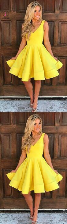 Simple V Neck Sleeveless Yellow Short Homecoming Dress Prom Dress KPH0073
