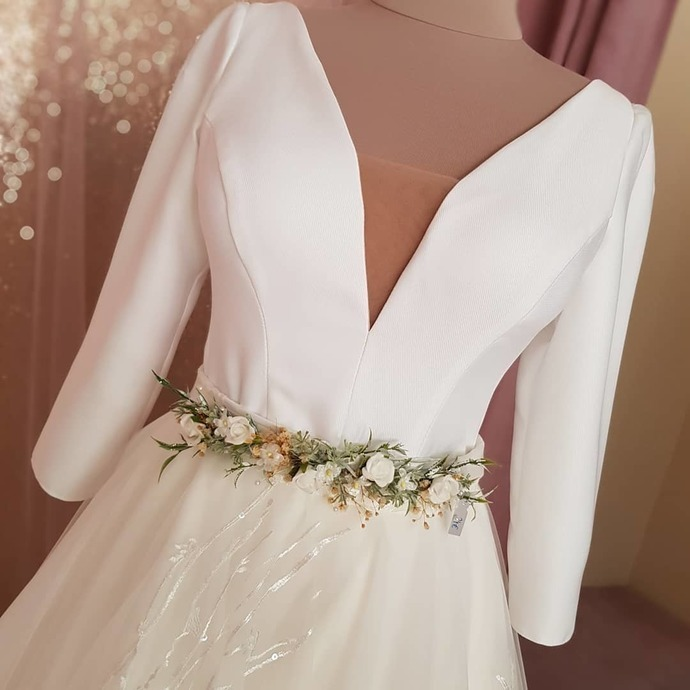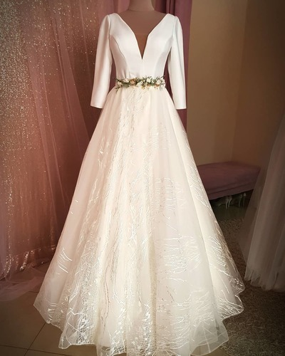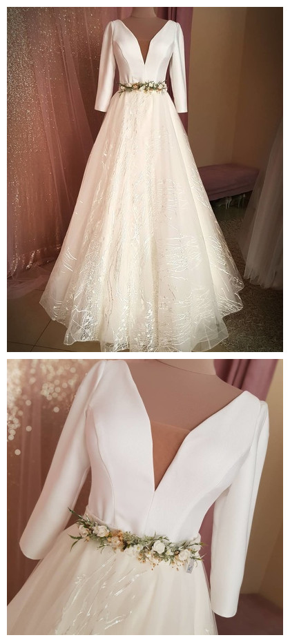 Fashion Lux V neck White Long Prom Dress, Full Sleeve Formal Wedding Dress KPW0078