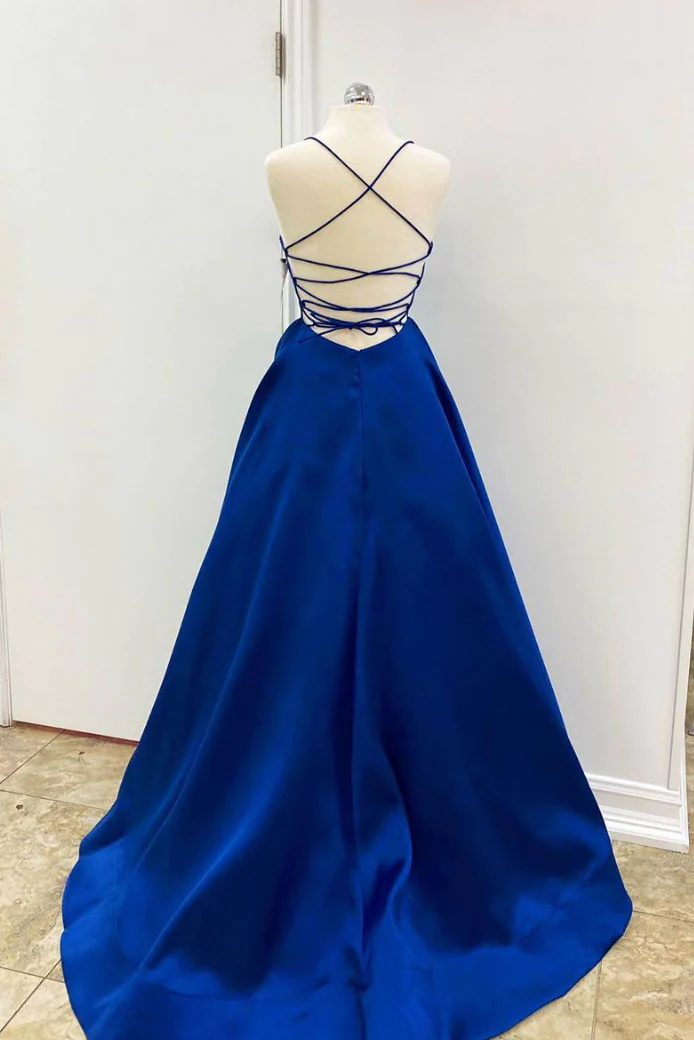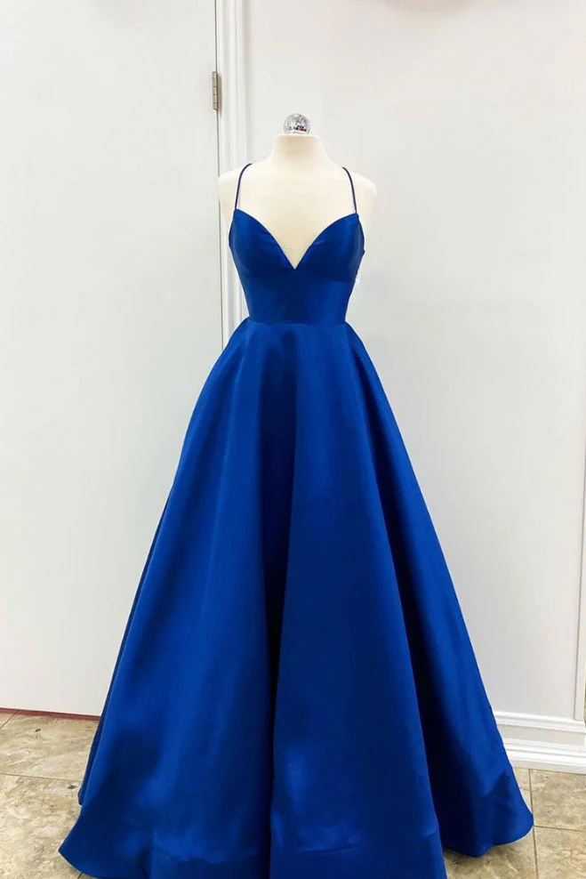 Kateprom Simple v neck blue satin long prom dress blue evening dress KPP0329