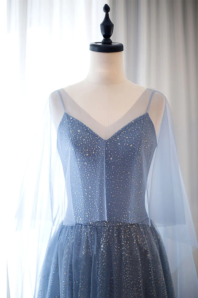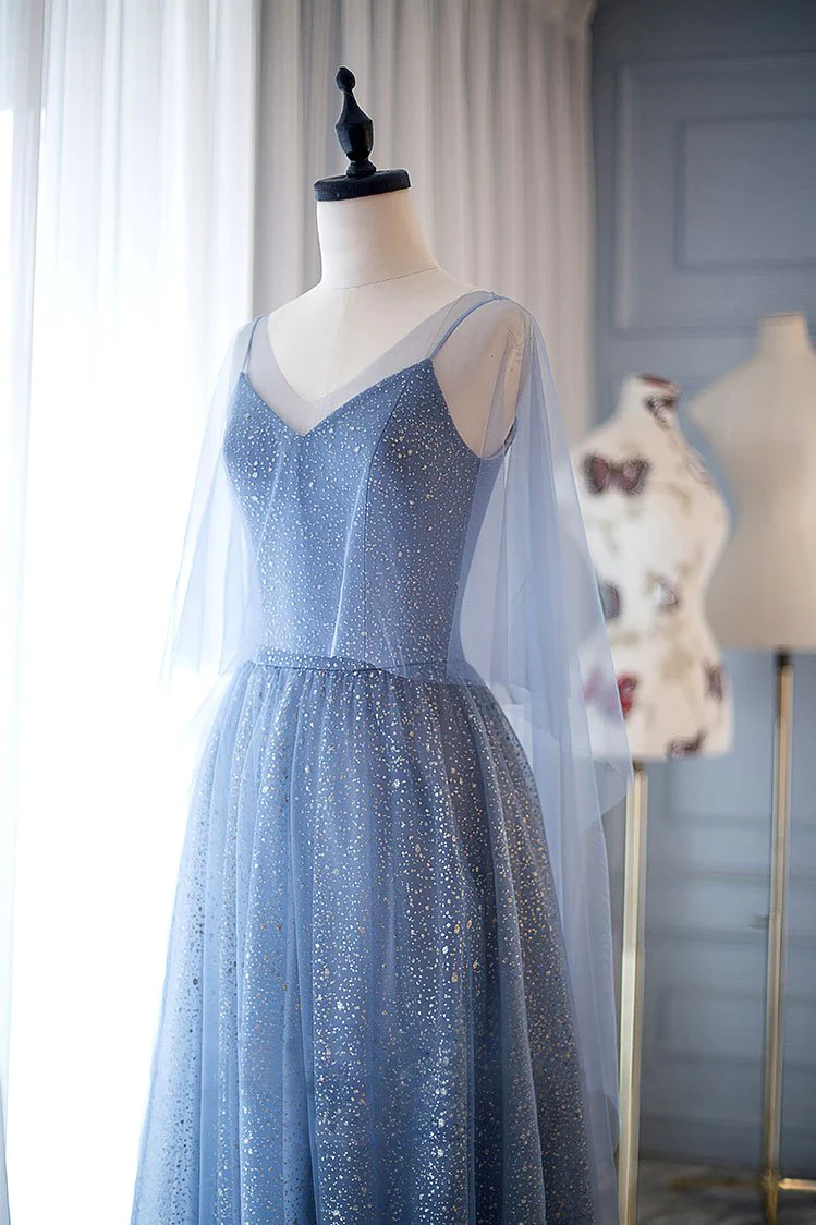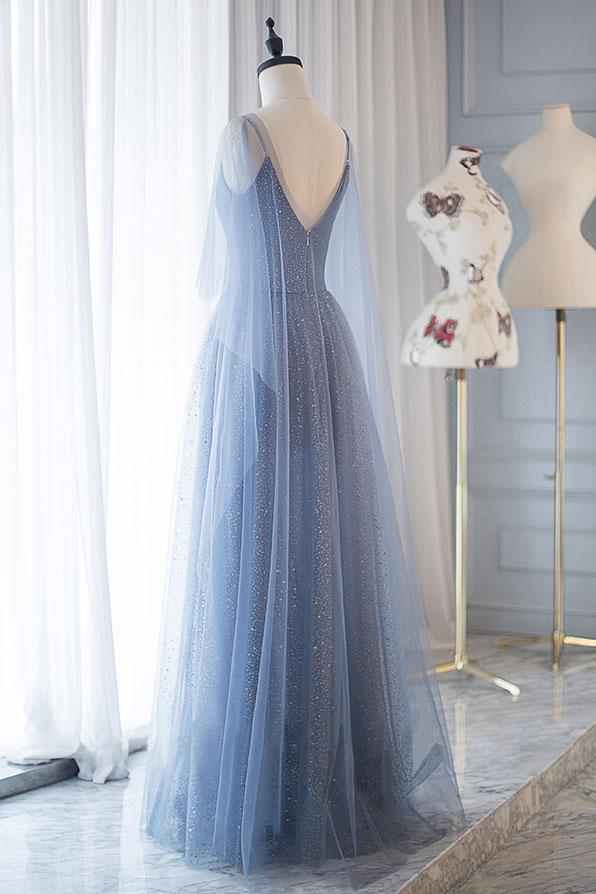 Lace Prom Dresses V Neck A Line Dusty Blue Long Sparkly Prom Dress KPP0368