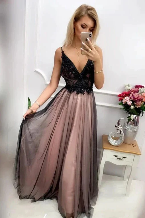 A-Line Tulle Beaded V-neck Long Prom Dress KPP0424