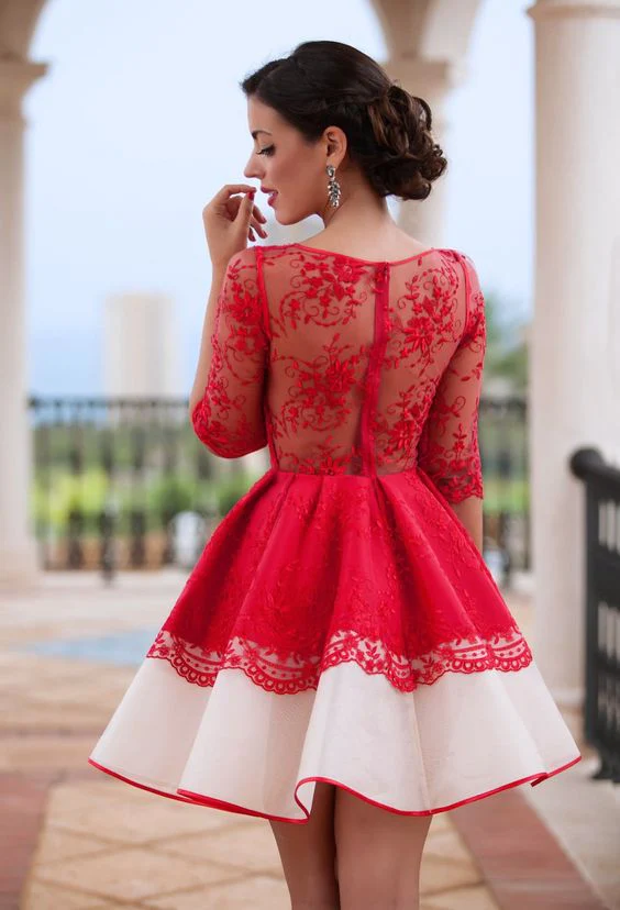 Chic Homecoming Dress Scoop A-line Red Lace Short Prom Dress Party Dress KPP0537