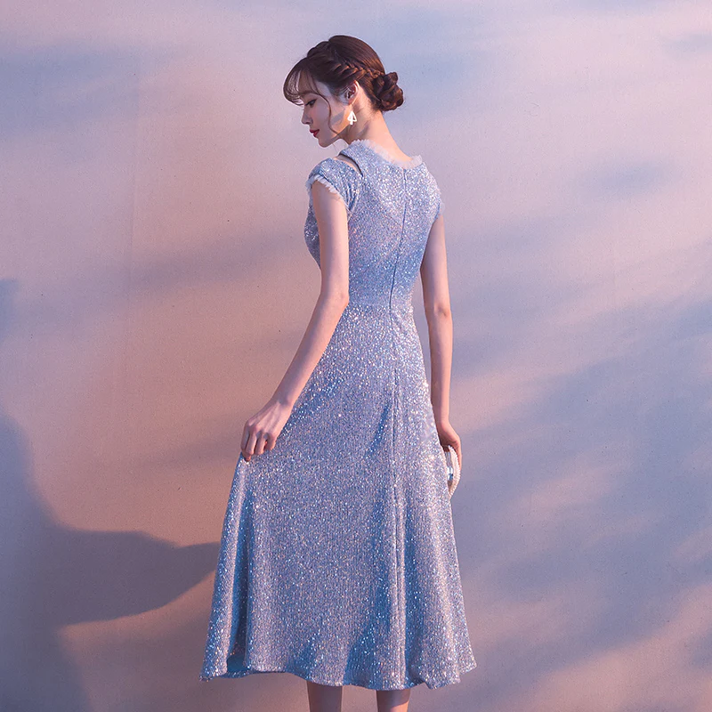 Cap Sleeve Light Blue Sparkly Homecoming Dress Tea Length Prom Evening Dress KPP0581