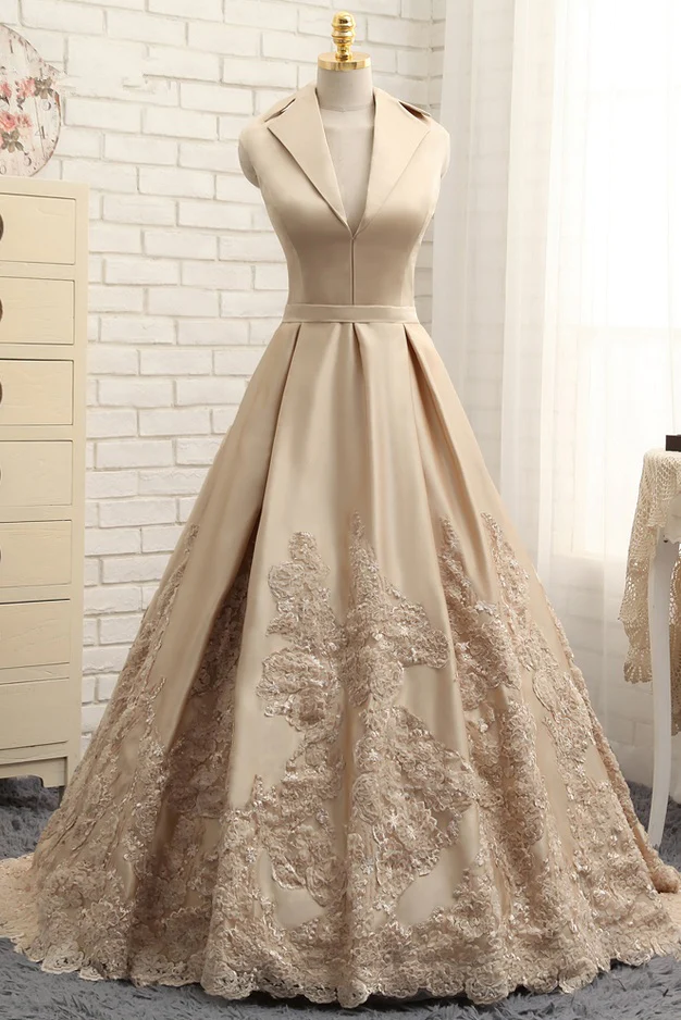 A-line V-Neck Cap Sleeves Satin Lace Appliques Long Formal Evening Dresses KPP0649
