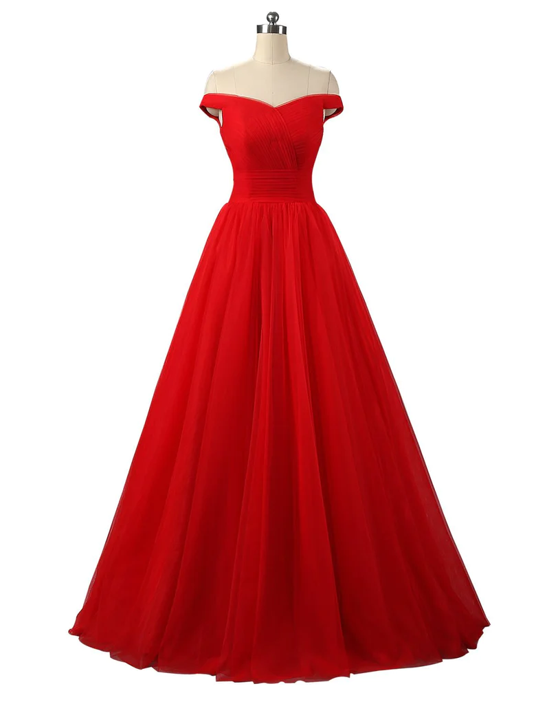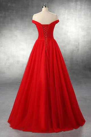 Elegant A Line Off The Shoulder Red Lace-up Floor-Length Prom Dresses KPP0654