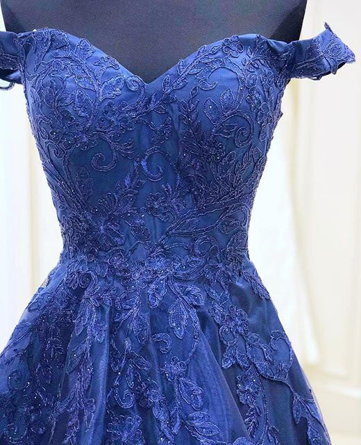 A Line Royal Blue Lace Appliques Sweetheart Beads Long Prom Dresses with Tulle KPP0673