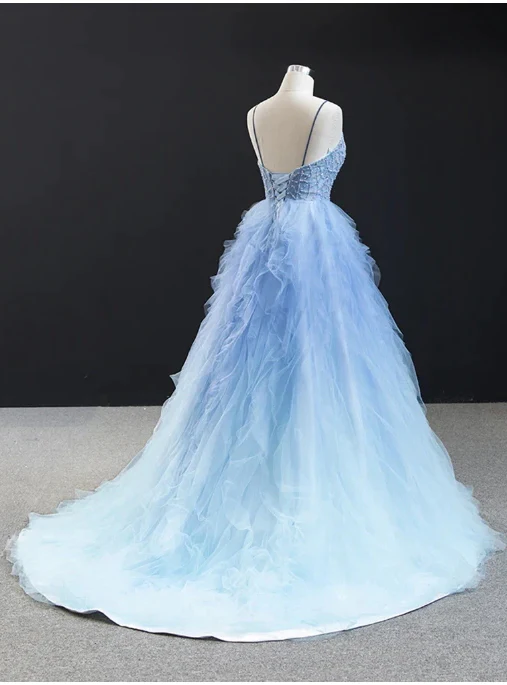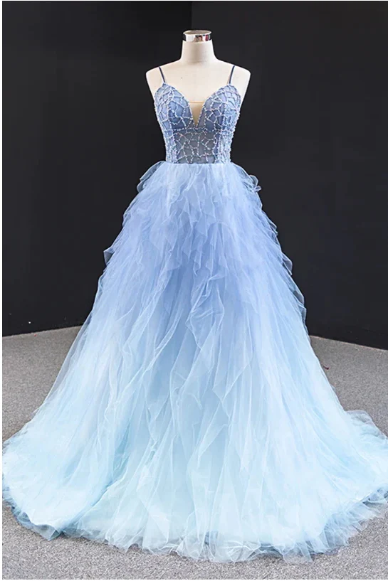 Light Blue Tulle Beaded Long Open Back Ruffles Prom Dresses Evening Dresses KPP0707