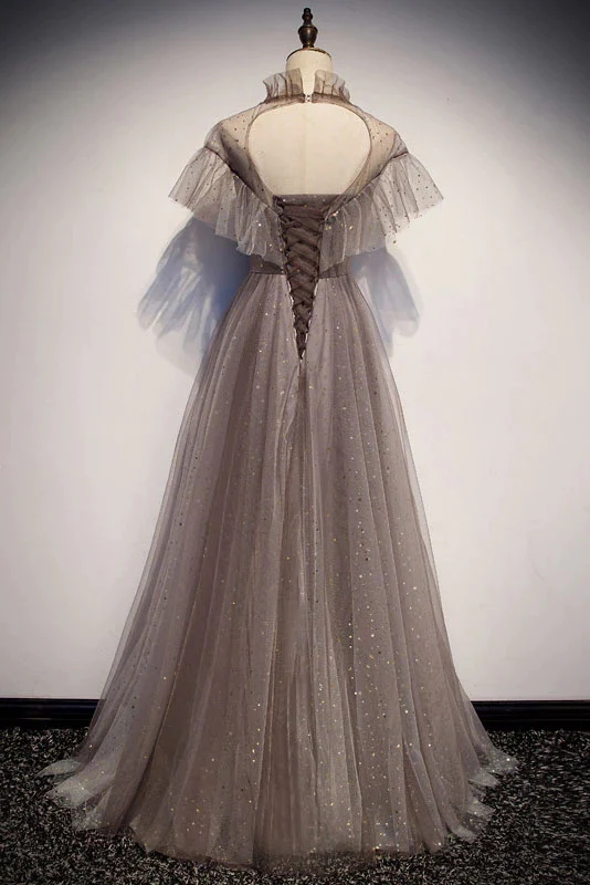 A Line High Neck Sparkly Prom Dress with Ruffles Shinny Evening Dress with Lace up KPP0722