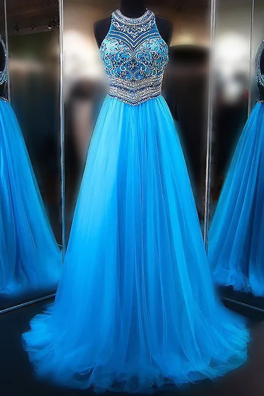 A line Blue Tulle Halter Beads Open Back Long Prom Dresses KPP0737