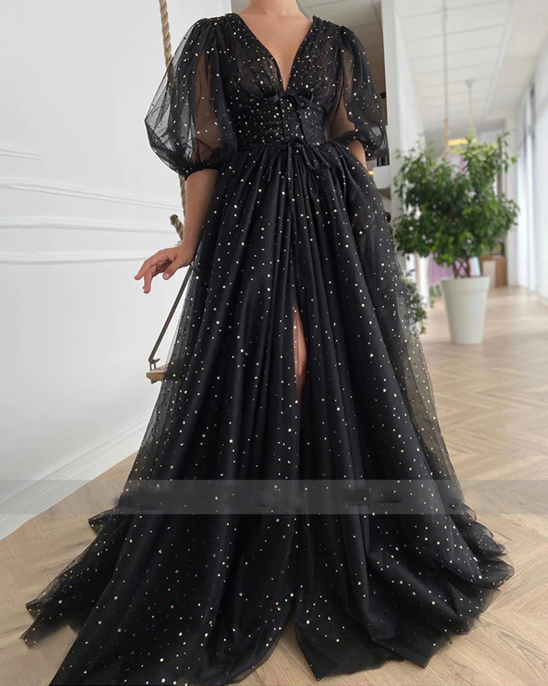 Black Starry Tulle Prom Dresses Sparkly V-Neck Half Puff Sleeves Ruched Wedding Party Dresses KPP0828