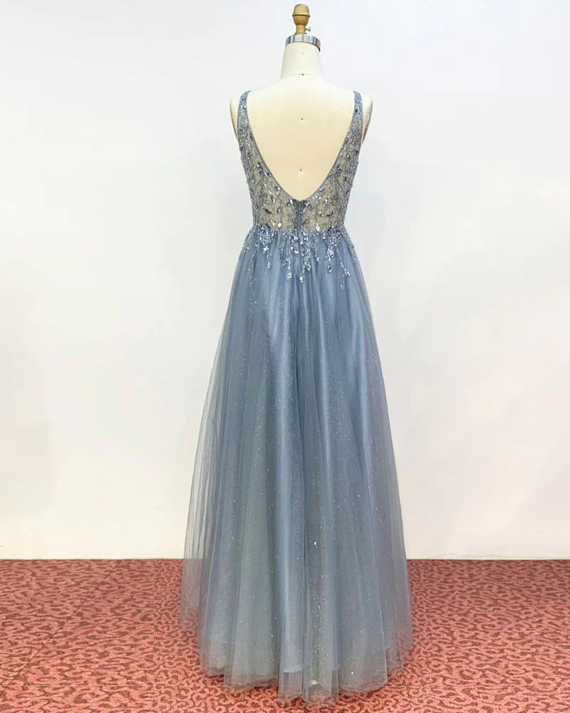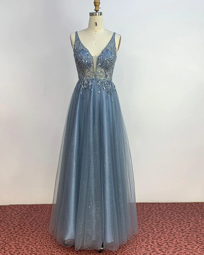 Amazing Glitter Blue V Neck Floor Length Long Prom Dress with Crystal Beaded Party Gowns KPP0856