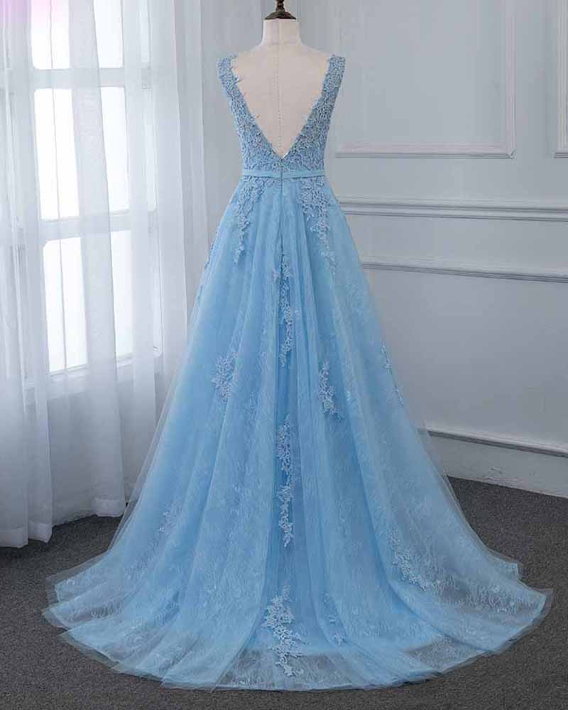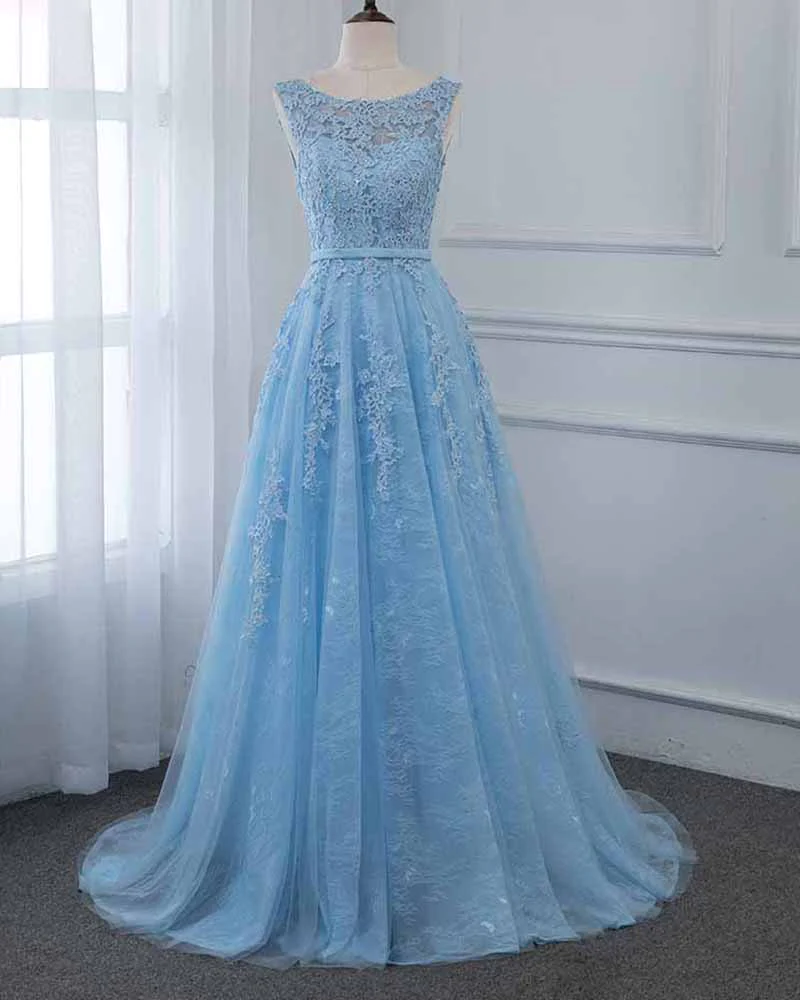 Scoop A Line Light Blue Tulle Lace Long Prom Formal Gown KPP0864