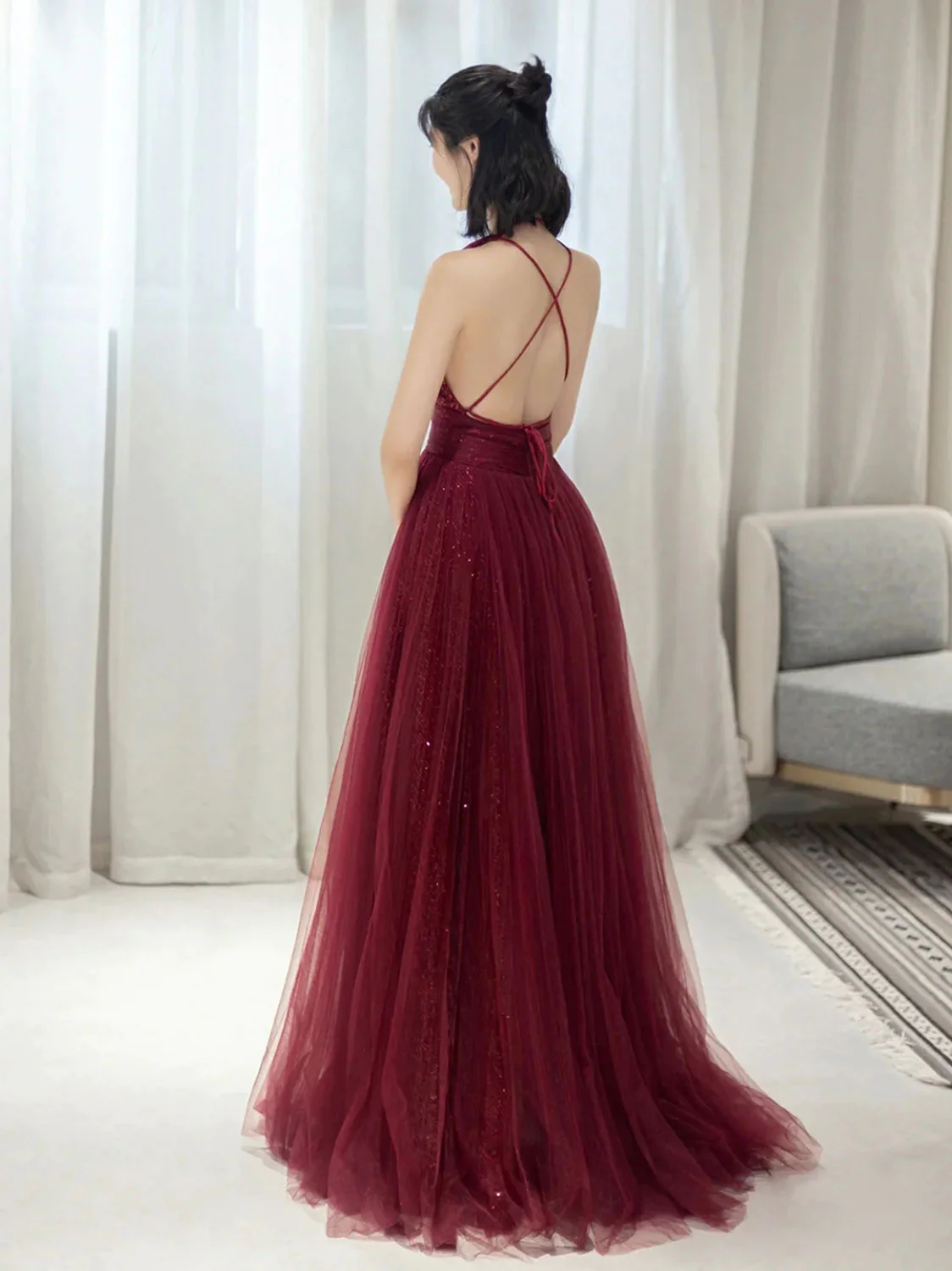 Burgundy Aline v neck tulle sequin long prom dress burgundy evening dress KPP1021