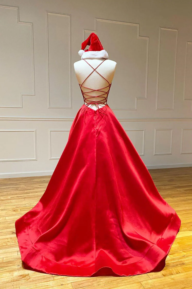 Red v neck satin long prom dress red satin evening dress KPP1105