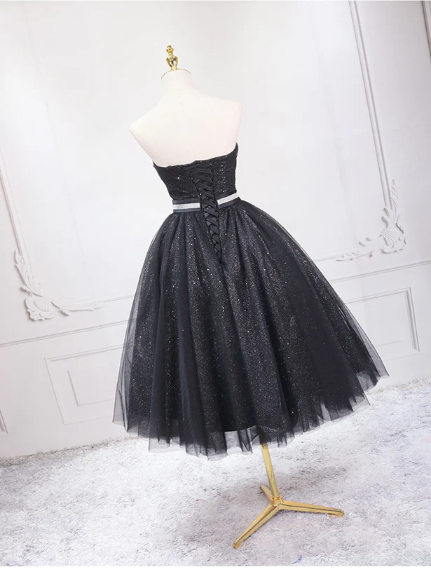 Shiny Black Sweetheart Tea Length Tulle Prom Dress, Black Evening Dress Homecoming Dress KPP1252