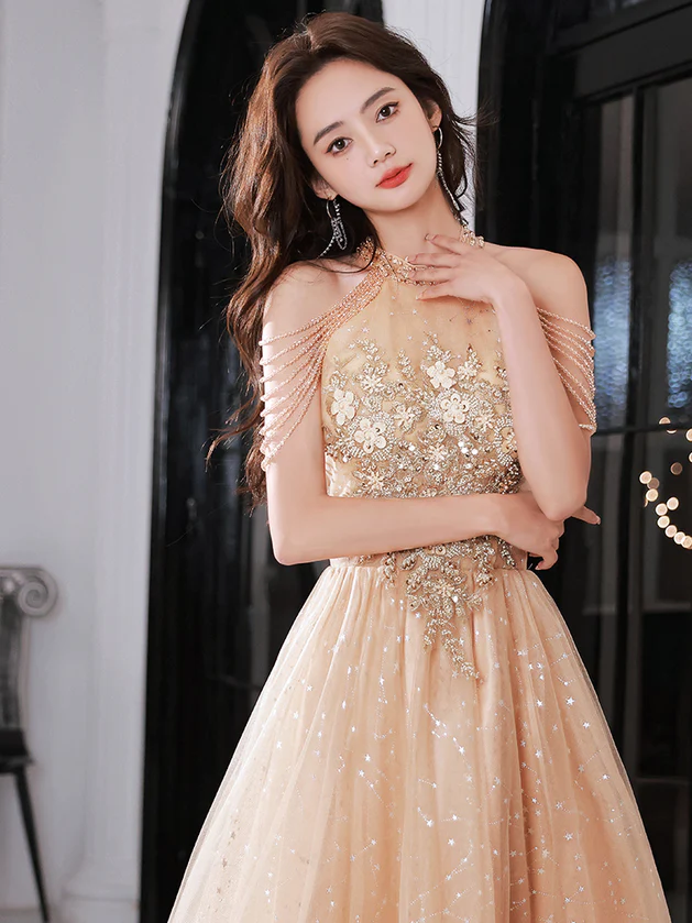 Champagne Halter Tea Length Shiny Tulle with Lace, A-line Short Prom Dress KPP1254