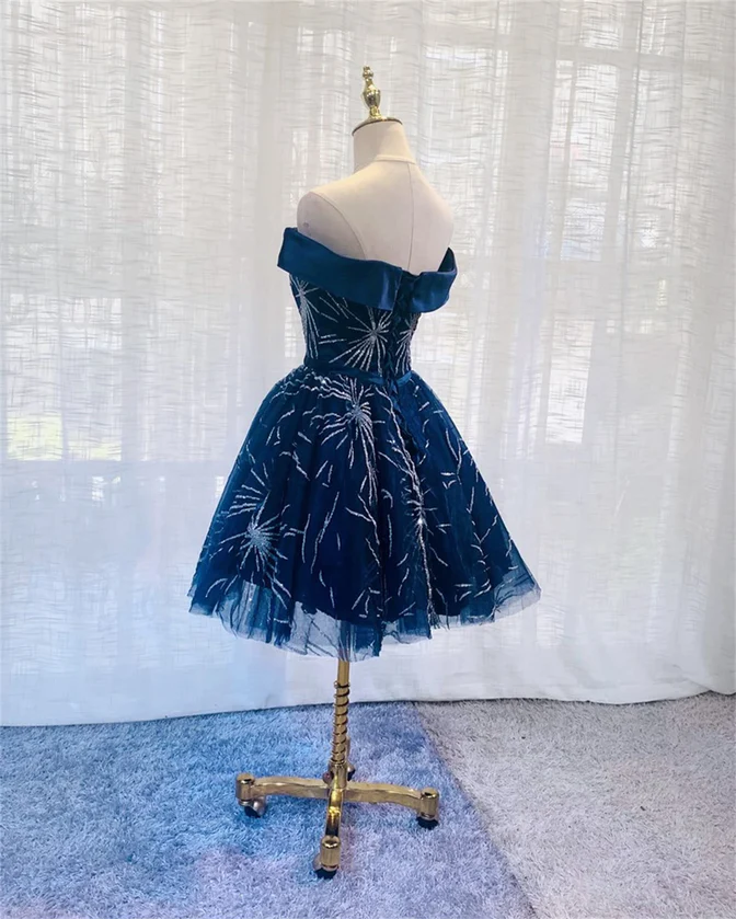 Dark Blue Tulle Off Shoulder Knee Length Party Dress, Blue Homecoming Dresses KPP1256