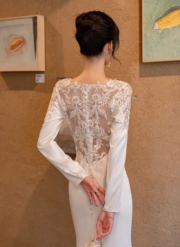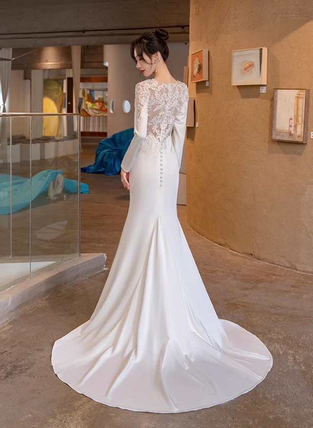 White Satin Mermaid Long Sleeves with Lace Wedding Party Dress, White Long Formal Dress KPP1340