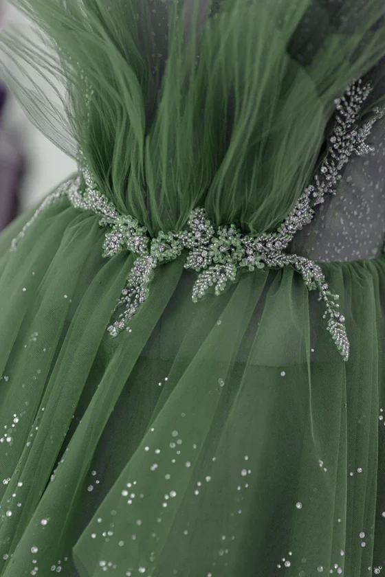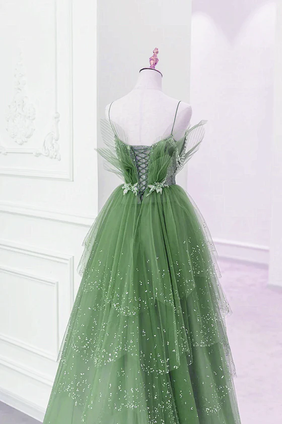 Glam Green Layers Tulle Straps Beaded Long Party Dress, Green Long Formal Dress KPP1368