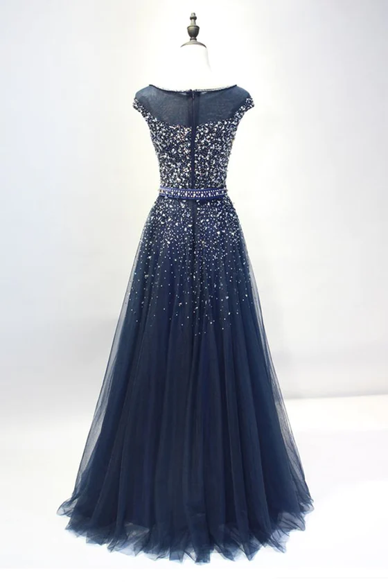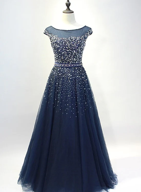 Navy Blue Shiny Sequins Round Neckline Tulle Party Dress, A-line Tulle Blue Evening Dress Prom Dress KPP1393