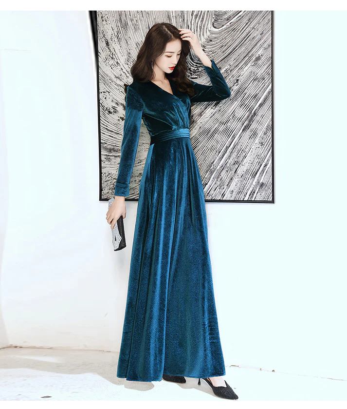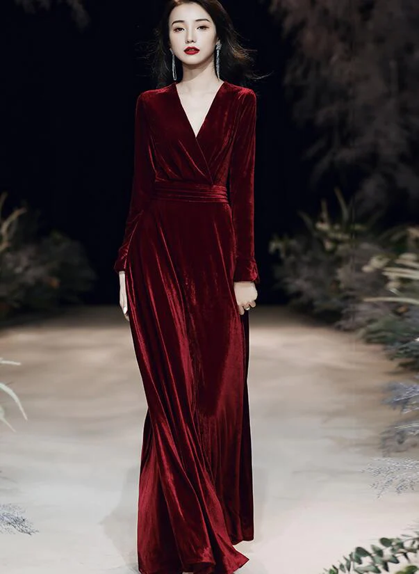 Charming Velvet V-neckline Simple Long Bridesmaid Dress, Long Sleeves A-line Party Dress KPP1400