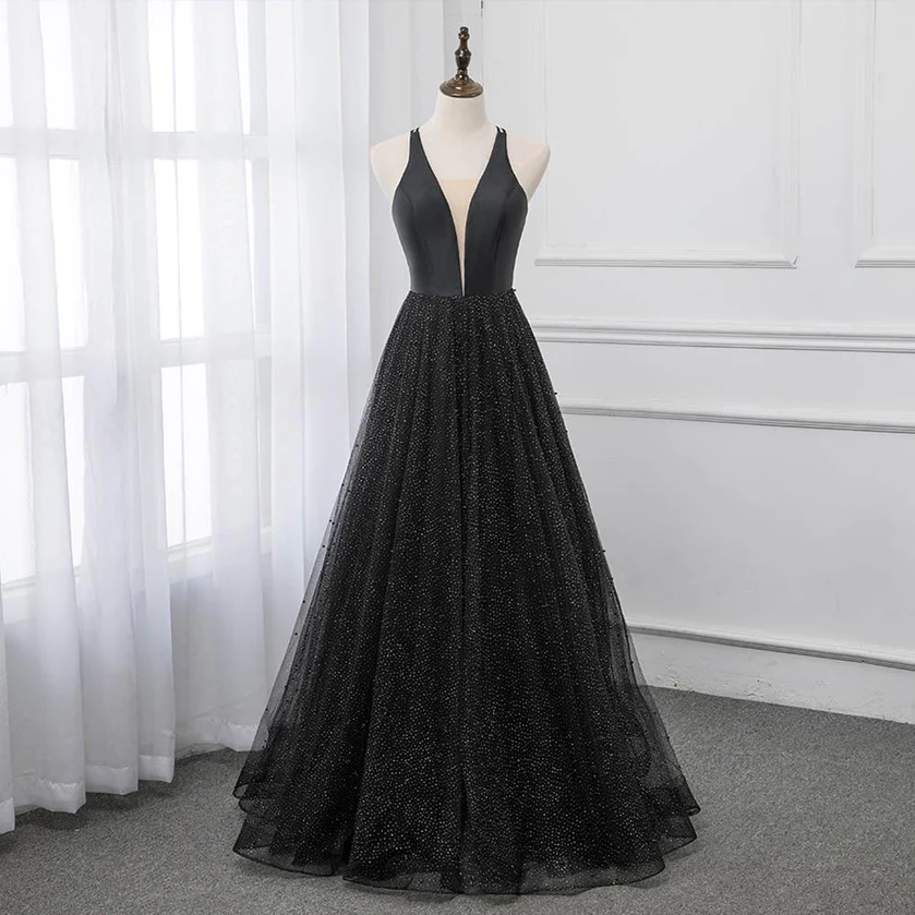 Black V-neckline Tulle and Satin Long Straps Cross Back Prom Dress, Floor Length Evening Dress KPP1401